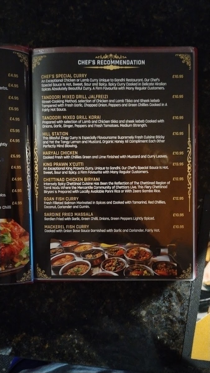 Located in Portsmouth, Gandhi stands out as a premier destination for Indian cuisine. This vibrant restaurant offers a diverse menu that marries traditional flavors with modern dining experiences. The chef's recommendations include exquisite dishes such as the Mackerel Fish Curry and Chettinad Chicken Biryani, each crafted to deliver rich and aromatic flavors. Vegetarians will enjoy selection options like Mushroom Muttar Masala and Punjabi Chole, showcasing the restaurant's commitment to satisfying all palates.